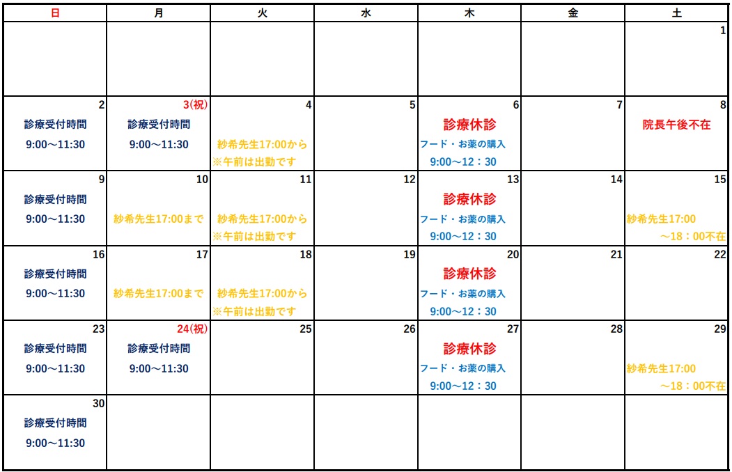 ※診療休診日のフードの購入・継続的なお薬の処方は「木曜日9:00~12:30」で対応させていただいております。