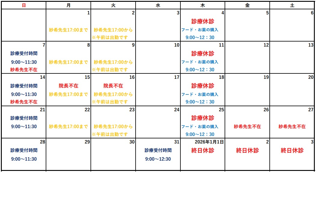 2026年1月1日から1月3日は終日休診となりますのでよろしくお願いいたします。 また、フードの購入・お薬のみの処方の対応もございませんので、ご希望の方は年内にご来院ください。 ご迷惑おかけしますがご理解賜りますようよろしくお願い申し上げます。