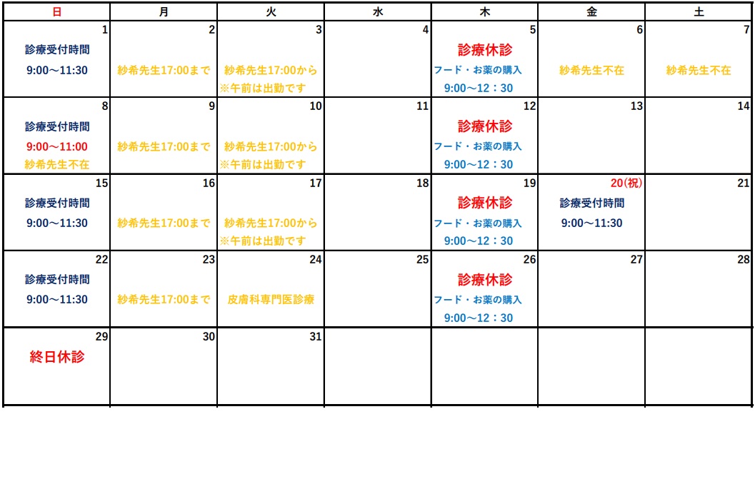 日曜日:29日(終日休診のためフードの購入・お薬の処方の対応もしておりません)