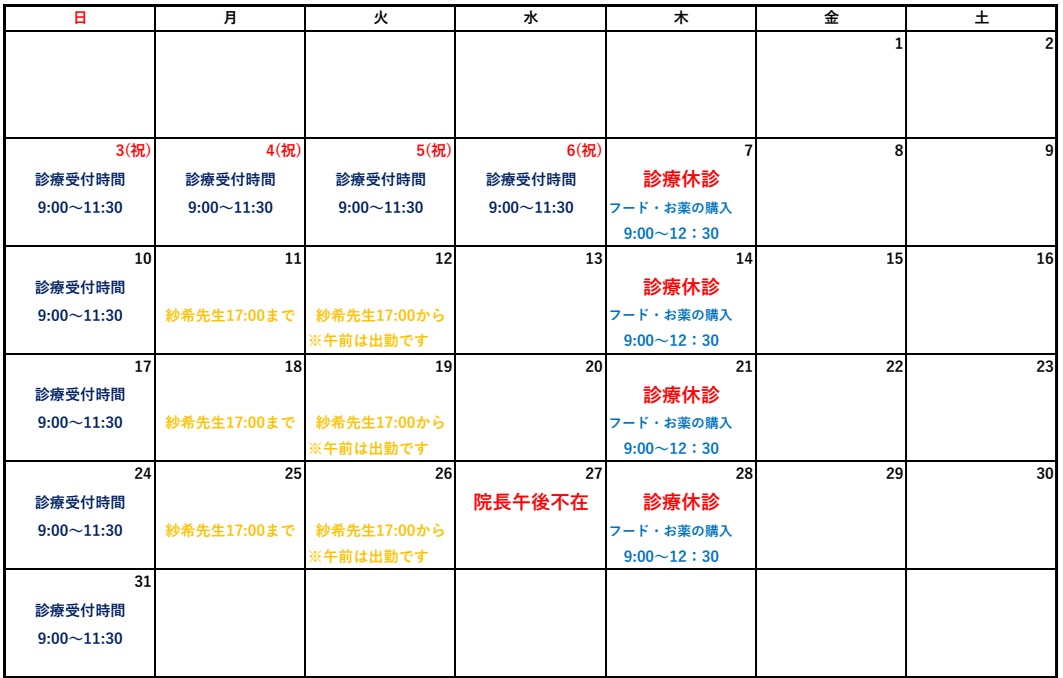 5月の診療休診日は以下の通りになります。